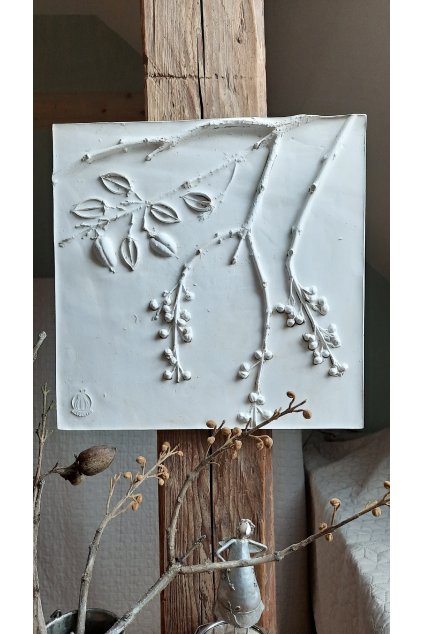 Skladba: Jinan dvoulaločný (Ginkgo biloba) - větvička s listy a plody Rozměry: š. 38,0 x v. 38,0 cm, tl.cca 2,5 cm+reliéf Materiál: sádra Zadní strana je ze...