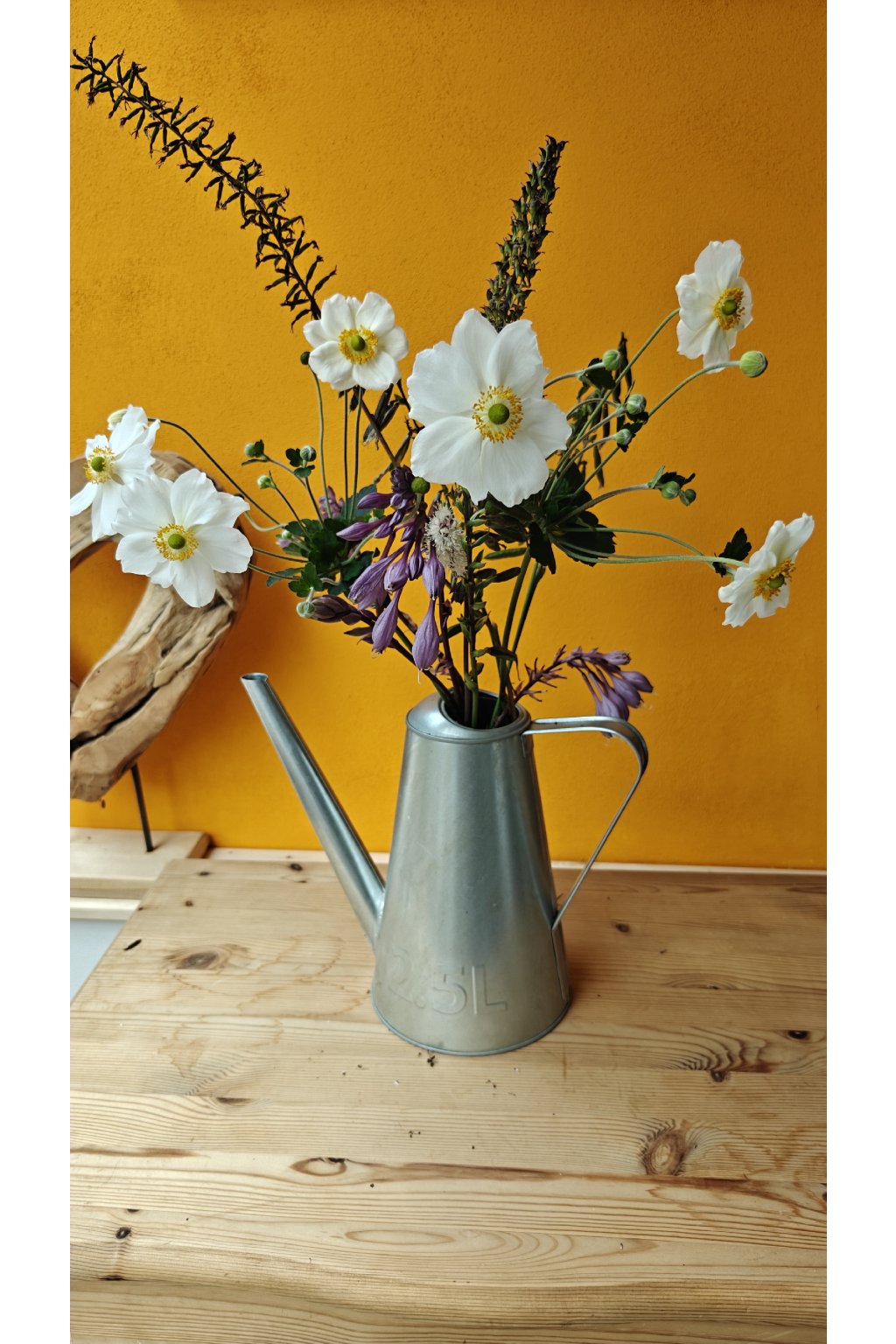 Skladba: květ sasanka japonská (Anemone japonica) a hosty, plody popelivky (Ligularia), ploštičníku hroznatého (Actaea racemosa) a hosty